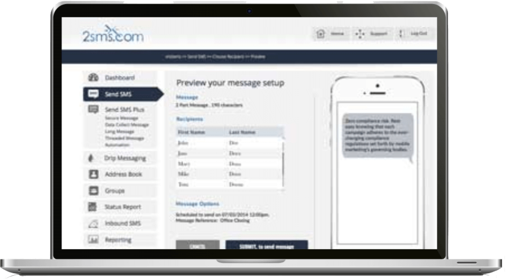 Our on-line web application platform is user friendly, quick, and lets you send SMS immediately. Use tools to manage your contacts, groups, sub accounts, and real time reports. 2sms has everything you need to manage your subscribers (opt-ins/opt-outs), as well as schedule future messages. It’s easy, simple, and reliable.